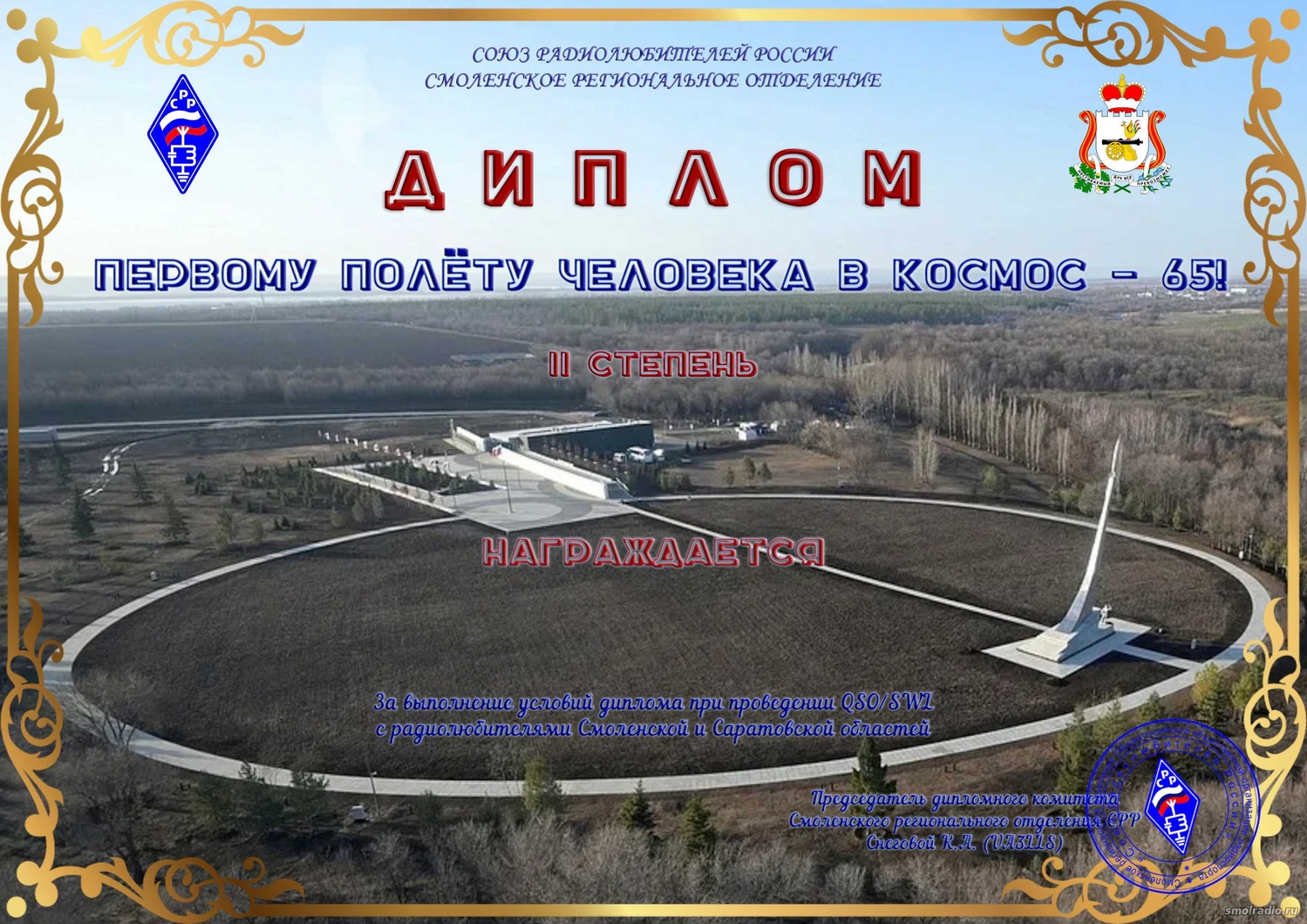 Диплом выдаётся радиолюбителям/наблюдателям России, стран СНГ и стран дальнего зарубежья за проведение QSO/SWL c радиостанциями Смоленской области с 10 по 16 апреля 2026 года всеми видами излучения на всех любительских КВ и УКВ диапазонах. Для выполнения диплома II степени необходимо набрать 35 очков. Для выполнения диплома I степени необходимо набрать 65 очков. Радиосвязь с радиостанциями из RDA SM-07 даёт: 8 очков, с остальными радиостанциями Смоленской области: 5 очков, с радиостанциями Саратовской области: 3 очка. Радиосвязь со следующими спецстанциями даёт 5 очков: