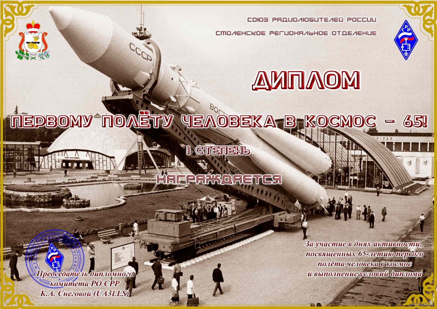 РО СРР Смоленской области проводит дни активности радиолюбителей Смоленской области с 10 по 16 апреля 2026 года посвященные 65-й годовщине первого полёта человека в космос.