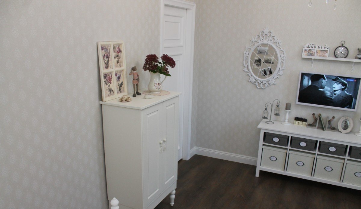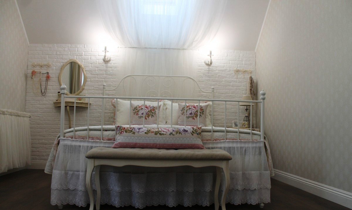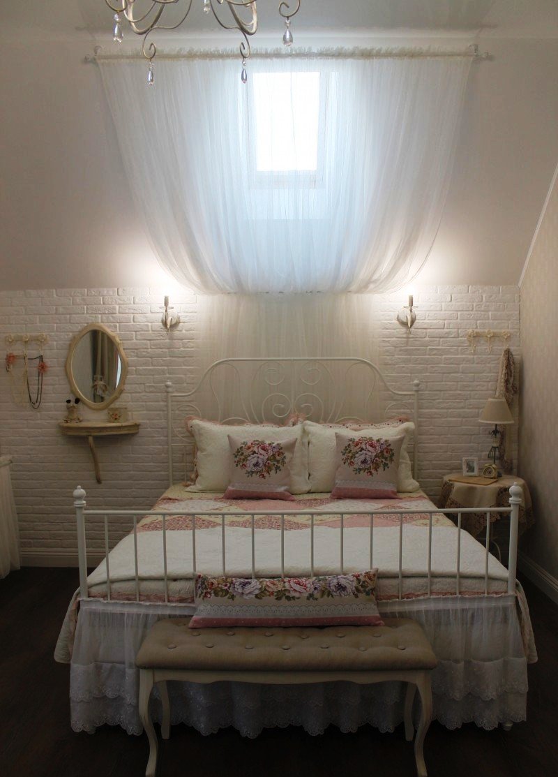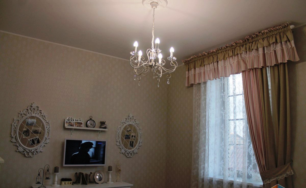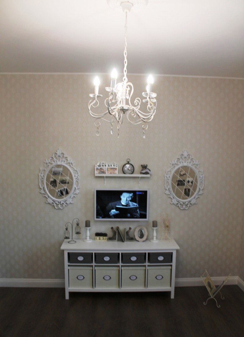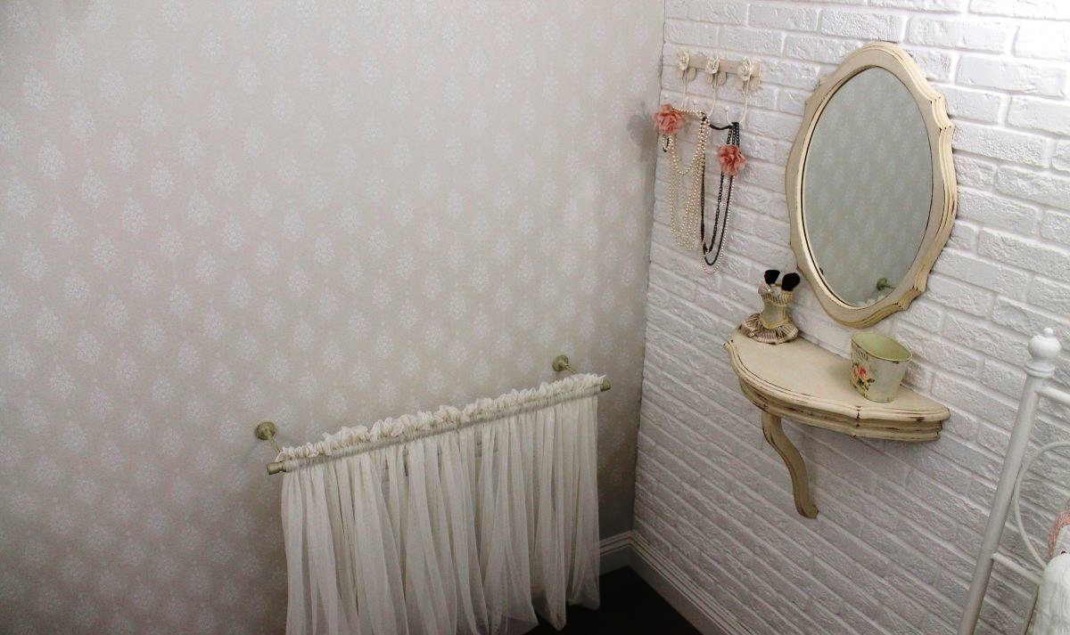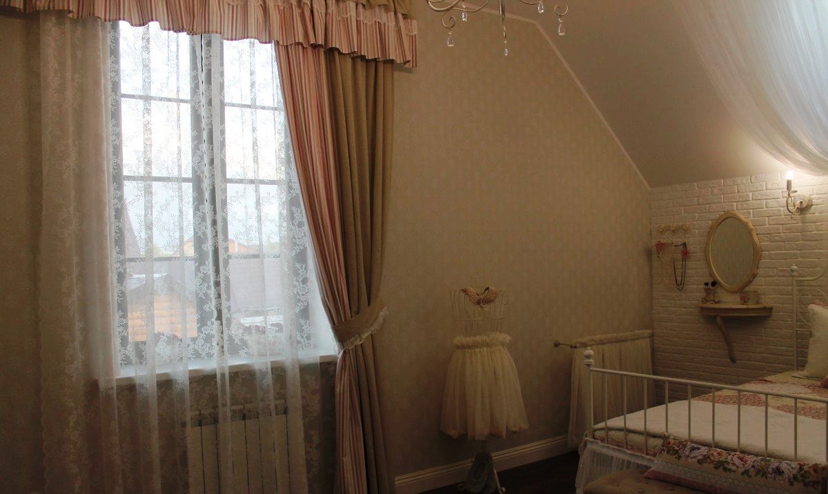 Всё началось с покупки покрывала. Дочерью были выбраны обои, на этом ее участие в процессе закончилось, так как она живёт отдельно, бывает только в гостях. Рамки с двух сторон от телевизора были куплены в ИКЕА, перекрашены баллончиком матовой краски, чтобы убрать блеск.Идея занавесок подсмотрена в ИКЕА, изготовлено на заказ.Батарея у зеркала выбивалась из общего стиля. Идея изготовить тюлевый полог пришла случайно, благо под руками оказались лишний кронштейн и карниз.
