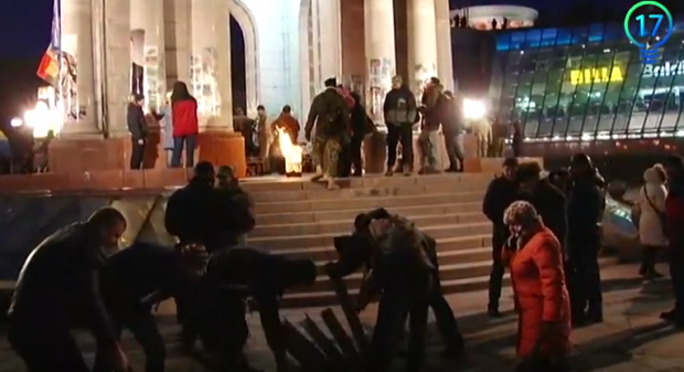 В Киеве активисты, которые чтят память погибших Героев Небесной Сотни на Майдане Независимости, вокруг стелы Независимости зажгли костры в мусорных баках.