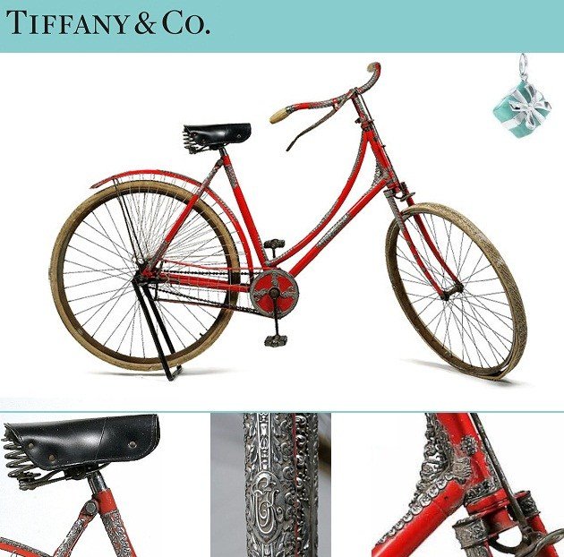 Велосипед от Tiffany & Co. за 50.000 долларов с ручками из слоновой кости, сиденьем из натуральной кожи и вставками в раме из теснённого серебра.