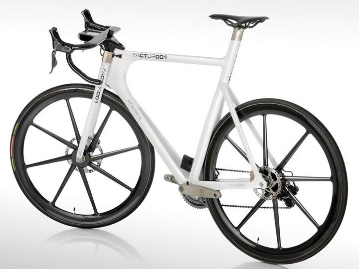 Гоночный велосипед Фактор 001, созданный из материалов, которые используются при производстве болидов Формулы-1. Белый велосипед весом 7,5 килограммов с бортовым компьютером и навигатором стоит около 32.000 долларов.