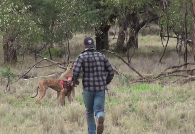 Во время охоты одна из хорошо обученных собак, преследуя кабанов по запаху, столкнулась с крупным кенгуру, который схватил её за защитное снаряжение (у кабанов очень острые клыки). Владелец собаки пришёл в ужас от того, что собака или кенгуру могут пострадать в конечном счёте, и бросился спасать обоих животных.