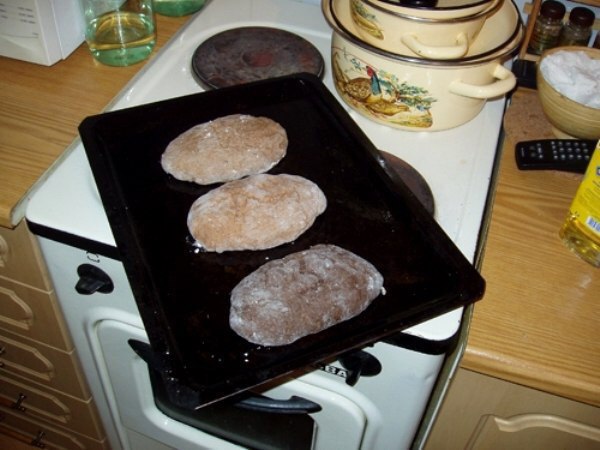 После полного высыхания заболонь слегка обжаривается с двух сторон в печи или в духовке на медленном огне. Лучше всего обжаривать ее большими кусками – меньше риска пережога, от чего меняются вкусовые качества. Обжарка идет до светло–коричневого цвета. В том случае, если пережарить (до темно–коричневого цвета) вкус хлеба станет более горьким.