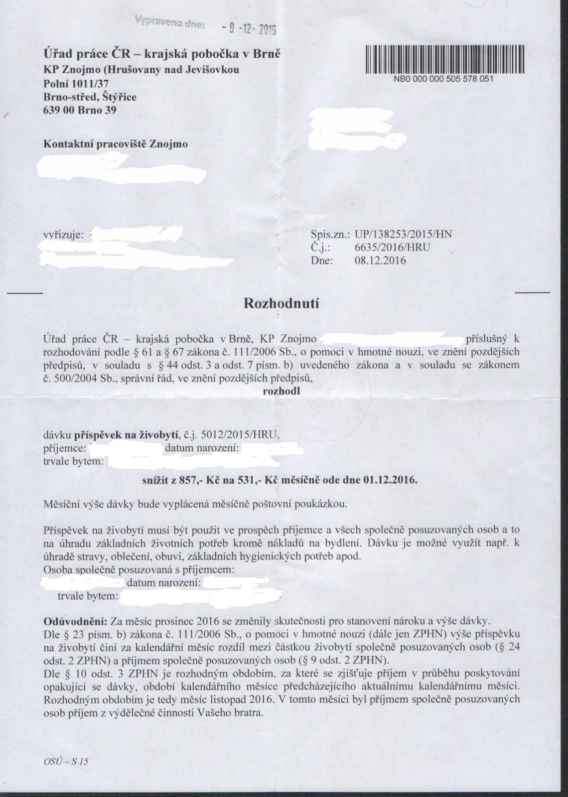 Obrátil se na mě občan naší obce (jsem místostarosta). Chtěl ode mě pomoci s vyřizováním invalidního důchodu. Při shromažďování podkladů k důchodu se mi do rukou dostalo nedávné Rozhodnutí z ÚP ČR o tom, že se mu příspěvek na živobytí snižuje z 857,- Kč měsíčně na 531,- Kč měsíčně.