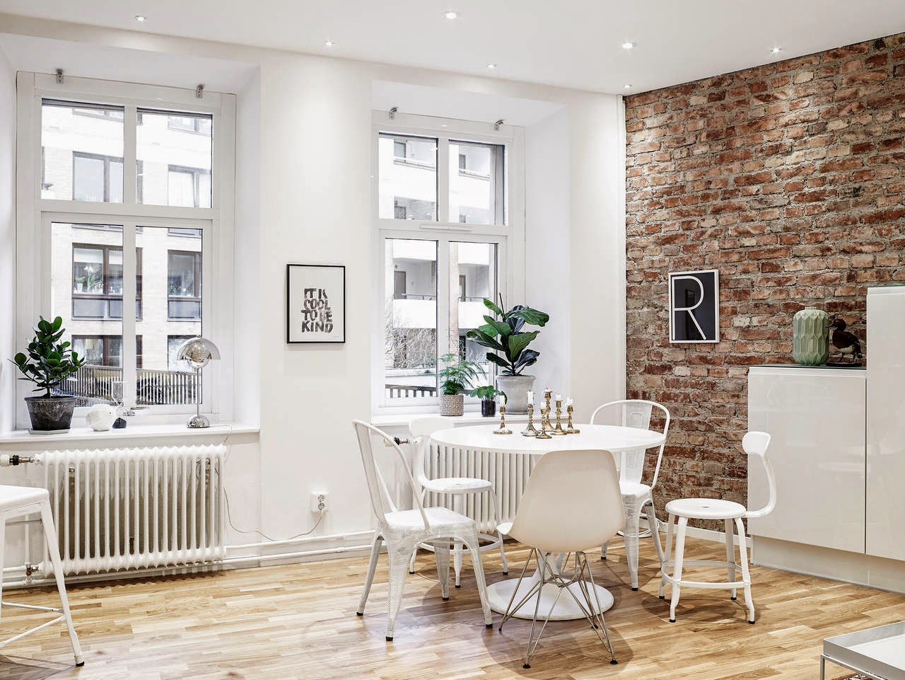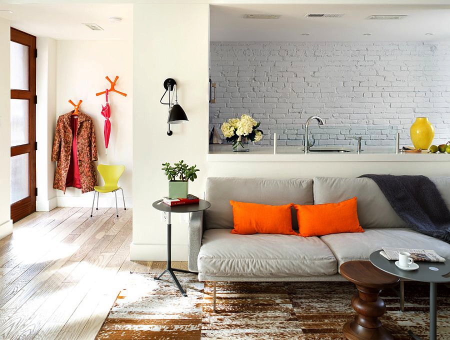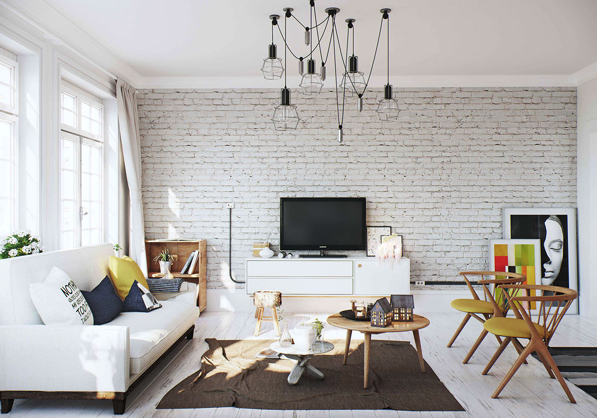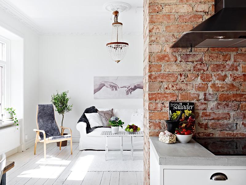 Для оформления пространства маленькой гостиной, можно использовать кирпичную стену, выбрав в качестве источника вдохновения скандинавский стиль, для которого характерны сдержанность, чистые прямые линии и светлые тона, что позволит создать интересный контраст. Для того, чтобы унифицировать пространство, можно на кирпичную стену нанести небольшие фрагменты той же краски, которой оформлены стены в интерьере или полностью покрасить ее в этот цвет.