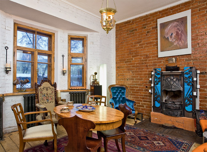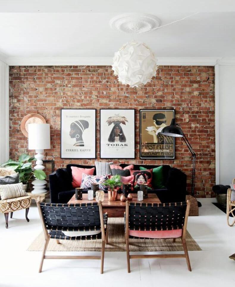 В эклектичном интерьере кирпичная стена может играть роль элемента, объединяющего пространство. А размещенные на ней постеры, позволят подчеркнуть тематику помещения. Однако, оформляя кирпичную стену, необходимо придерживаться чувства меры. Поскольку сам по себе фон достаточно активный и обращающий на себя внимание, то при неправильном планировании, эклектичный стиль в интерьере, будет выглядеть как беспорядок.