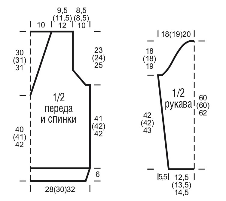 Через 23 (24) 25 cм = 64 (67) 70 р. от начала пройм все петли закрыть в одном ряду.