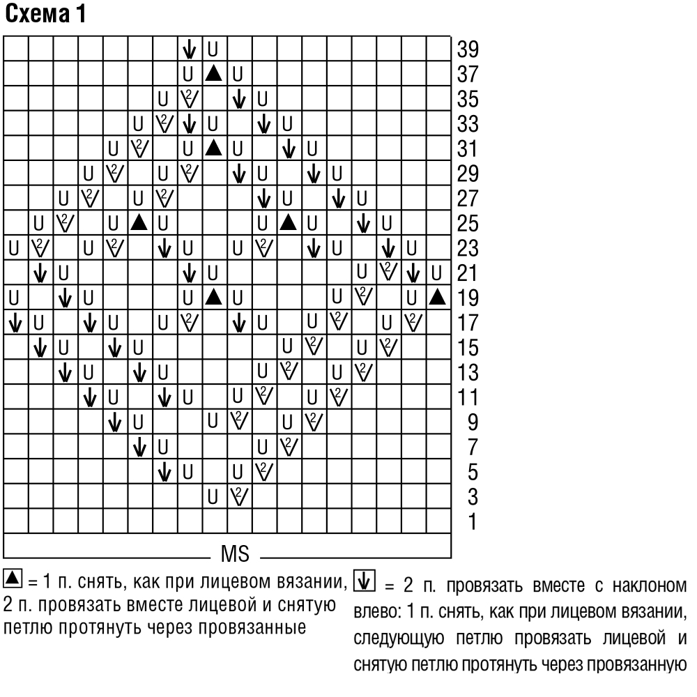 Вязать по кругу на 40 п. симметрично сквозному узору 1, для этого схему считывать слева направо и вместо 2 п., провязанных с наклоном влево, 2 п. провязывать вместе лицевой.