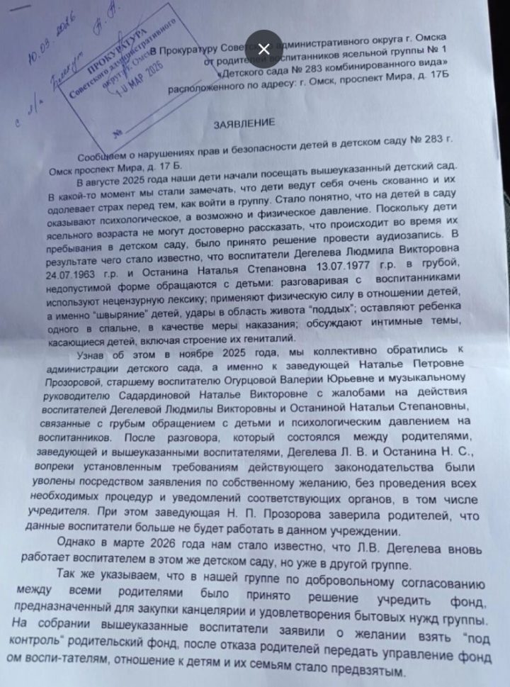 Прокуратура округа подтвердила слова родителей: в течение 2025 года воспитатели грубо обращались с детьми в ясельной группе, применяли «непедагогические методы воспитания». Также проверка обнаружила нарушения пожарной безопасности, трудового законодательства, случаи незаконного взимания денег с родителей. Материалы дела направили и в полицию.
