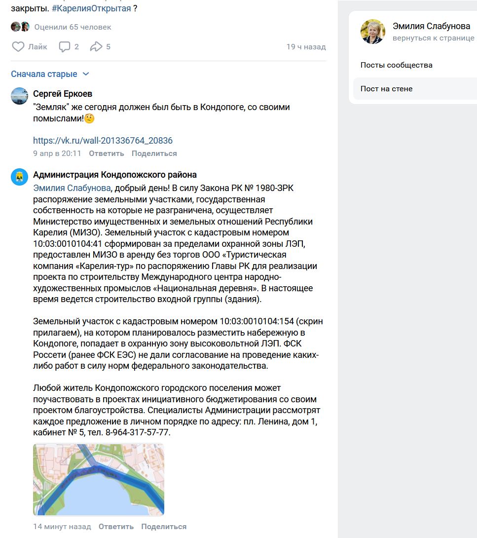 В администрации Кондопожского района в ответ заявили, что ООО «Туристическая компания «Карелия-тур» получила землю в аренду без торгов по распоряжению губернатора Карелии Артура Парфенчикова. Чиновники отметили, что земля, где планировалось построить набережную в Кондопоге, попадает в охранную зону высоковольтной ЛЭП, а ФСК Россети (ранее ФСК ЕЭС) не согласовали проведение каких-либо работ.