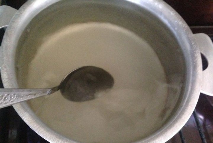Я допустил ошибку. Сначала нужно было вылить фруктозный сироп, а уже потом в него выливать концентрат. В итоге концентрат немного прилип ко дну. Пришлось изрядно размешать половником )).