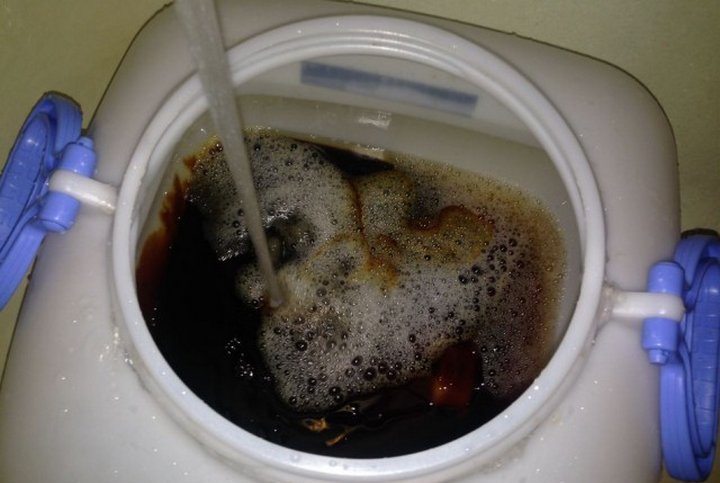 У меня начала переть пена. Ее было 1/4 от всей тары. Такого не было бы, если бы вода уже была в баке. Но пена верхом не пошла, так как уже набралось нужное количество воды. Холодной воды.