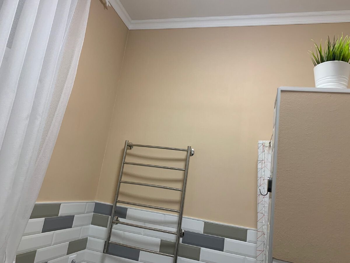 А ту часть стены, которая выше плитки (высота 1,5 м), я зашпаклевал, наклеил стеклохолст и покрасил краской для влажных помещений — мне это обошлось в пару дней и 2500 рублей вместе с рулоном стеклохолста, 5-ти килограммовым мешком шпаклевки и литровой баночкой краски.