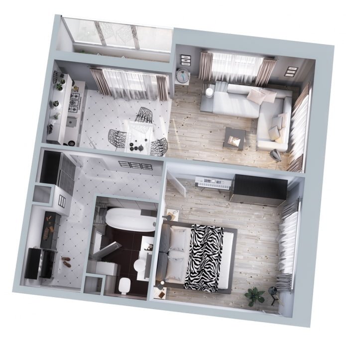 В квартирах этого типа есть одна или две жилые комнаты, а также гостиная, объединённая с кухней. Официально евродвушки считаются однокомнатными, но жилых помещений в них два, где кухня-гостиная занимает около 16 кв. м. и больше.