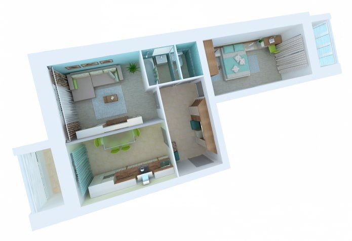 Внешне напоминает детскую рубашку без пуговиц, поэтому так называется. Комнаты-рукава в такой квартире располагаются друг напротив друга, а их окна выходят на улицу и во двор. Центральной частью является кухня или санузел. У такой планировки много плюсов: