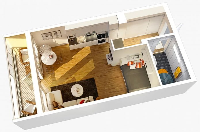 Помимо двушек и трёшек распашонкой может быть и однушка, в которой жилая комната и кухня разделены санузлом.