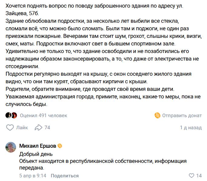 В ответ заместитель мэра Михаил Ершов заявил, что здание находится в республиканской собственности, а «информация передана». Кому — не уточняется.