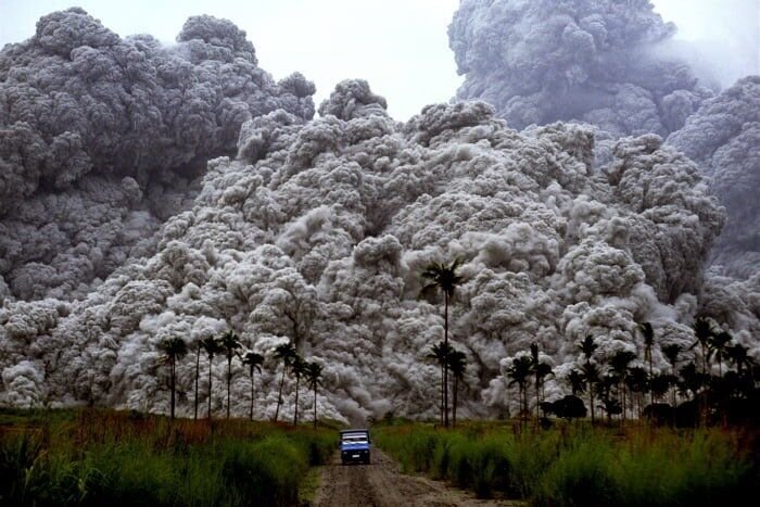 Извержение вулкана Пинатубо, Филиппины, лето 1991 года/ © yavarda.ruС магмой происходит то же самое. Находясь в глубинах земли под давлением, она постоянно испытывает кору на прочность, ища ту самую "пробку", которую можно выбить. Иногда выхода на поверхность она не находит и тогда медленно застывает на глубине. В этом случае вулкан не образуется. Но если слабое место будет найдено, то магма с силой вышибет "пробку". Однако это происходит не сразу и не вдруг. Вначале она будет изнутри давить на твердь и заставлять ее подниматься и пучиться. Это и есть ответ на вопрос: "почему если вулкан, то обязательно гора?" Процесс сродни образованию фурункула на теле — прыщик же никогда не нарывает на ровном месте и процессу его "извержения" предшествует рост и увеличение в объеме.
