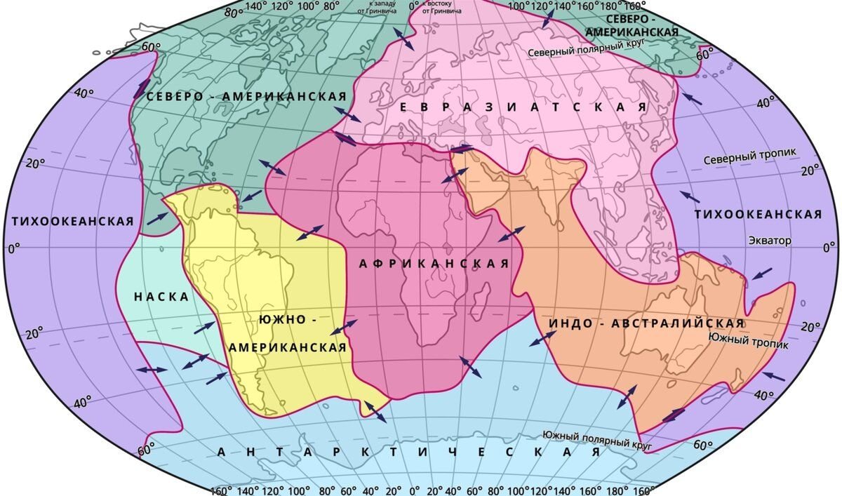 Упрощенное строение Земли/ © geography-ege.ruНо в отличие от куриного яйца с монолитной скорлупой, литосфера нашей планеты вовсе не однородна. Мало того, что она разной толщины, так еще и состоит из чешуек. Но это довольно фривольное название, а вот наука называет их литосферными плитами. Почему тогда чешуйки? А потому что плиты располагаются не стык в стык, а наползают одна на другую — примерно так, как рыбья чешуя. Плиты эти не одинаковы по размерам. Современная литосфера делится на 8 крупных и несколько десятков мелких плит.