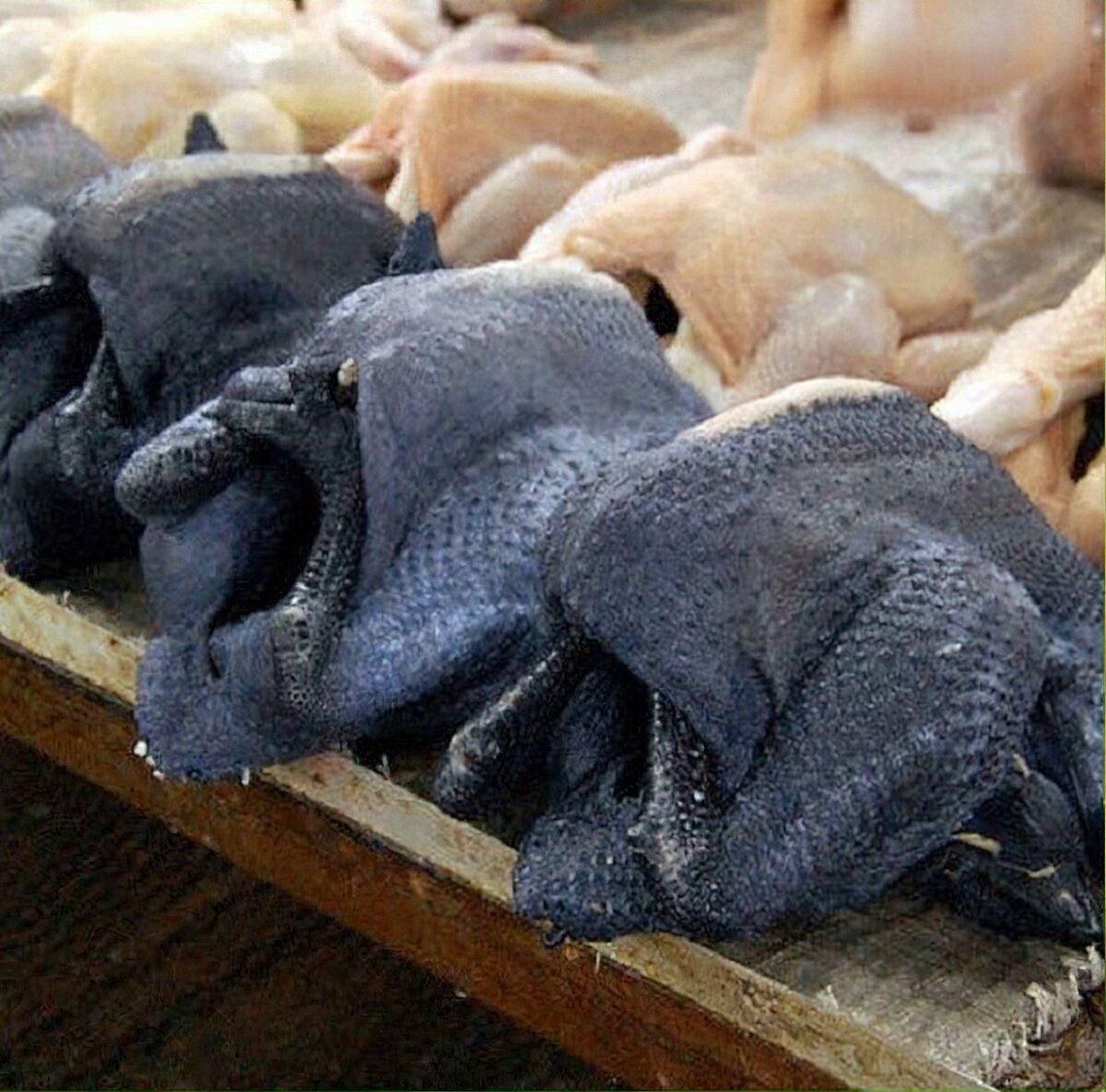 Тушки китайских шелковых кур, которые не имеют отношение к аям чемани/ © kulturologia.ruНа самом деле, это китайские шелковые куры, кожа которых действительно черного цвета. А вот мясо у них — как у обычной курицы, разве что несколько темнее. Аям чемани редко забивают ради мяса, ведь это декоративная птица, и ценится она в первую очередь за свой внешний вид. Однако мясо, как утверждают гурманы, у них более нежное, вкусное и менее жирное, чем обычная курятина.