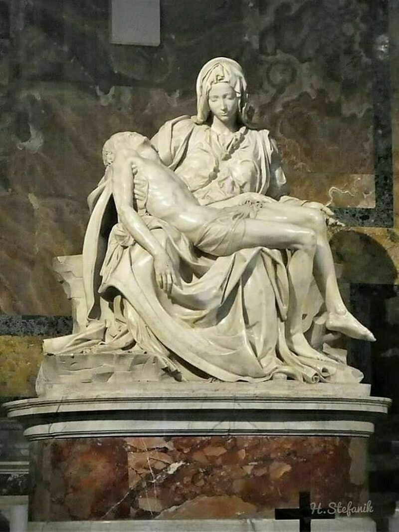 Он закончил ее спустя два года (1500 г.), вырезав фигуры из куска цельного мрамора. Это единственная работа, где Микеланджело оставил свою подпись.