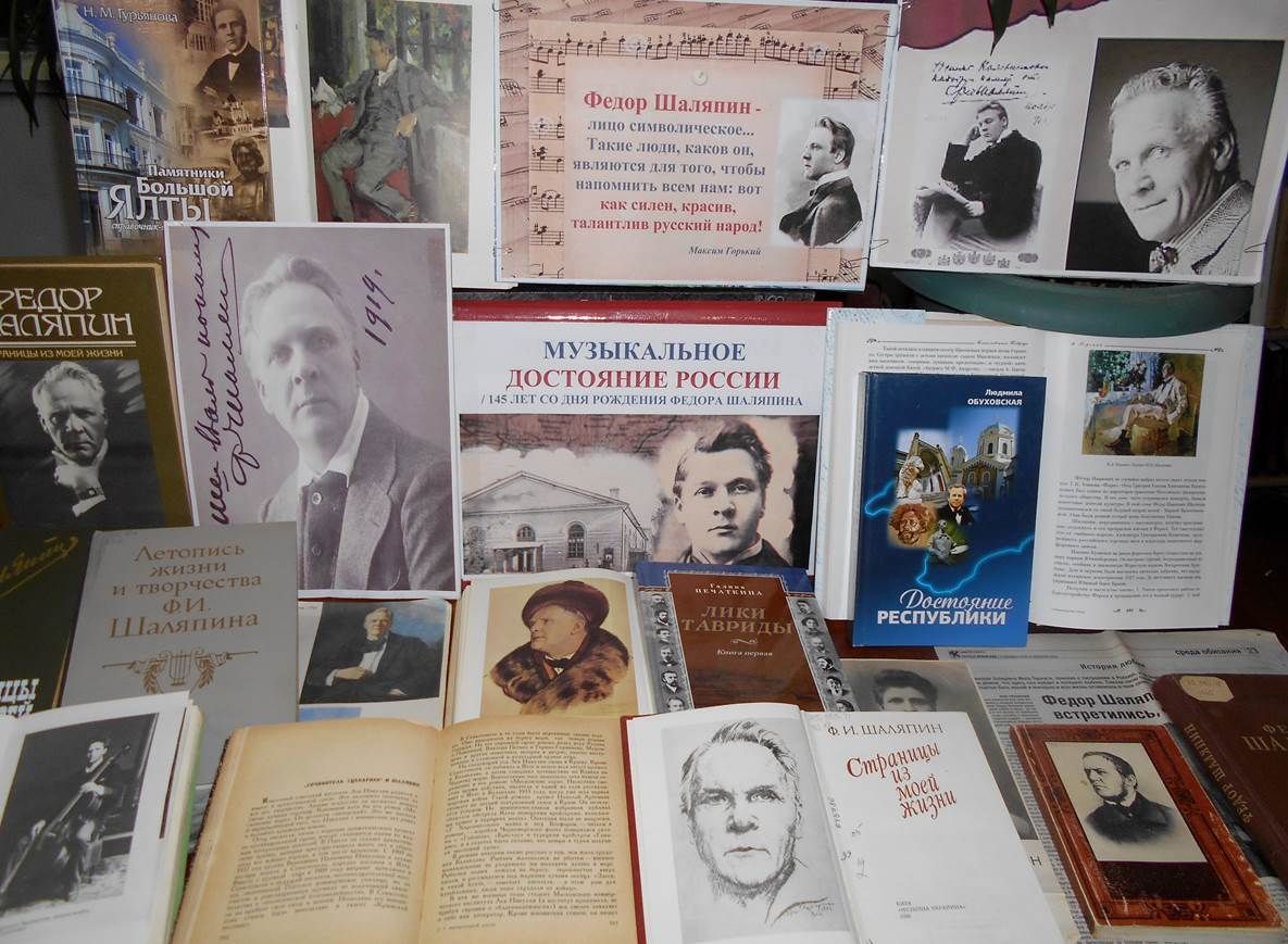Материалы, статьи из краеведческих периодических изданий, книги, посвященные жизненному и творческому пути величайшего русского певца представлены на выставке великого имени «Музыкальное достояние России». Особое место на выставке заняли книги крымских авторов Л.А. Обуховской «Достояние республики», Н.М. Гурьяновой «Памятники Большой Ялты», Г.А. Печаткиной «Лики Тавриды», Г.Н. Кунцевской «Благословенная Таврида», П.А. Дегтярева и Р.М. Вуля «У литературной карты Крыма», открывшие для гостей мероприятия удивительный Крым Федора Шаляпина.