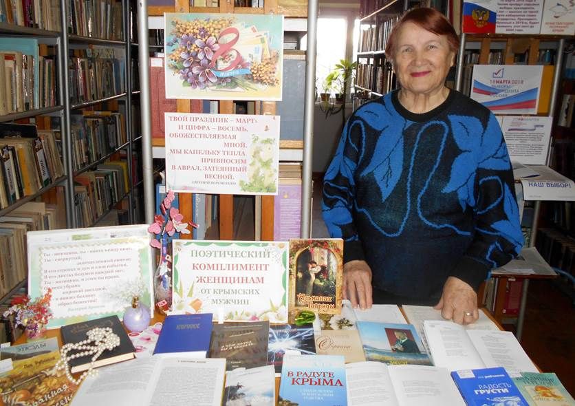 «Твой праздник – март и цифра – восемь, обожествляемая мной..», - эти строчки из стихотворения Евгения Веремеенко стали цитатой выставки-поздравления «Поэтический комплимент Женщине от крымских мужчин», на которой представлены издания и сборники писателей и поэтов нашего полуострова - из Симферополя и Ялты, Евпатории и Феодосии, др. городов Крыма.