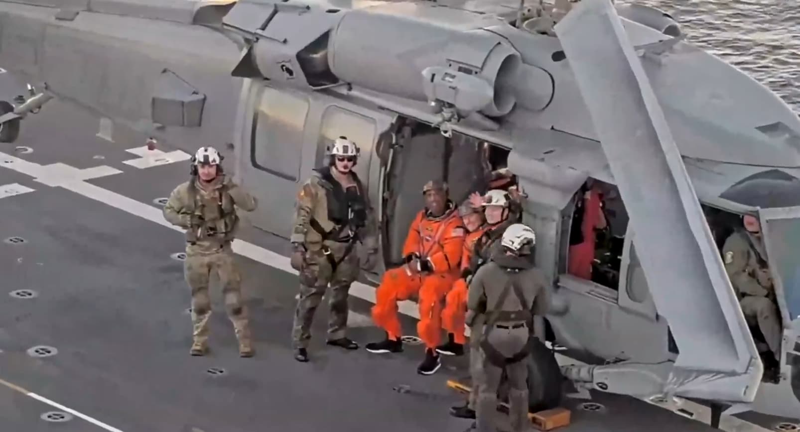 После выхода из капсулы участники миссии пересели в надувной плот, откуда их доставили на борт десантного корабля USS John P. Murtha с помощью вертолётов. Астронавты проходят первичный медицинский осмотр, их состояние оценивается как стабильное. Финальный этап миссии прошёл штатно. Все операции проходили в штатном режиме под контролем специалистов NASA.
