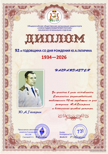 РО СРР Смоленской области проводит дни активности радиолюбителей Смоленской области с 01 по 12 марта 2026 года посвященные 92-й годовщине со дня рождения Ю.А. Гагарина. Учрежден и предложен к выполнению диплом "92-я годовщина со дня рождения Ю.А. Гагарина".