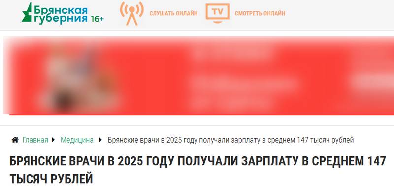 В конце января «Брянская губерния» смело заявила: «Брянские врачи в 2025 году получали зарплату в среднем 147 тысяч рублей». Цифра удивляет. Откуда она взялась? Оказывается, так вольно в «Брянской губернии» истолковали слова главы ФФОМС России Ильи Баланина, который заявил что среднемесячная зарплата врачей в 2025 году составила 147 тысяч рублей. Но это именно в целом по стране. Одна только столица поднимает средний доход врачей очень существенно. Очевидно, что в среднем брянские врачи получают меньше. На сколько?