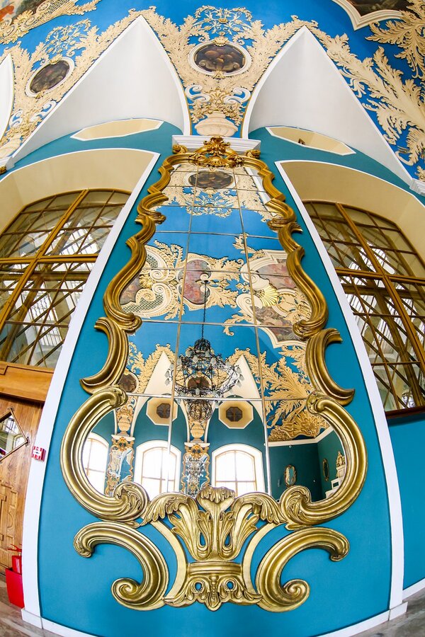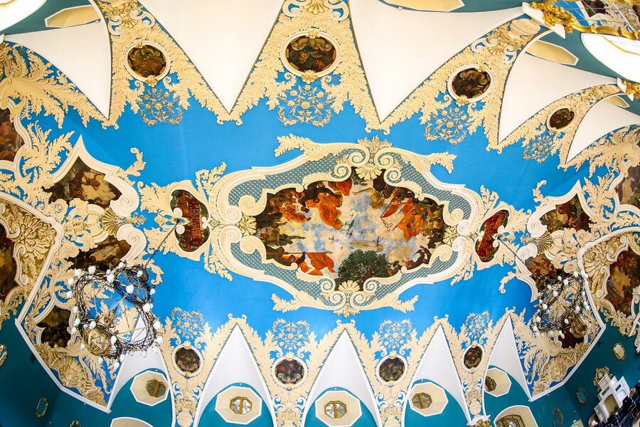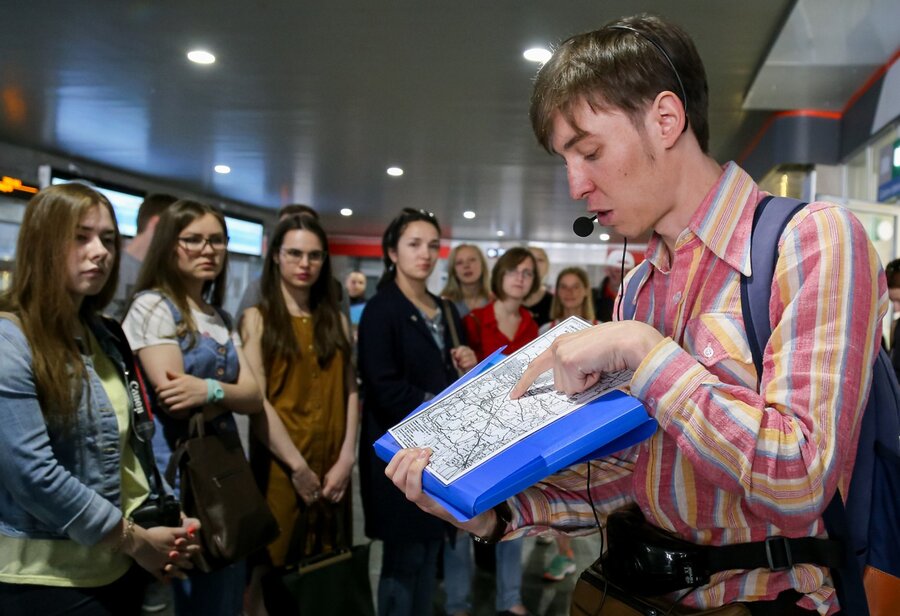 На экскурсии об истории вокзалов рассказывается по хронологии: от Ленинградского до Казанского. На каждом из них группа рассматривает интересные приметы времени, инженерные приемы и детали оформления. Но самые интересные открытия ждут публику именно в конце. Их заводят в VIP-зал ожидания Казанского вокзала. Попав в него, группа сразу же начинает фотографировать голубой плафон на потолке. Глядя на изящные линии и украшения, сложно представить, что о основе этого – железобетонный лист толщиной шесть сантиметров. И не сразу бросается в глаза некоторое несоответствие, на которое нам указывает экскурсовод Айрат Багаутдинов.Выставка в бывшем царском вестибюле