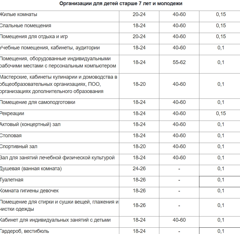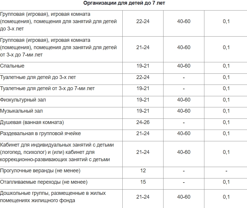 Сегодня санитарно-эпидемиологические требования к температуре в школах и детских садах регламентированы нормативами СанПиН. В жилых комнатах допустимая температура воздуха должна находиться в пределах 20-24 градусов, в ванных комнатах и туалетах — от 18 до 26. В организациях для детей и молодежи всё зависит от возраста детей, а также от назначения помещений.