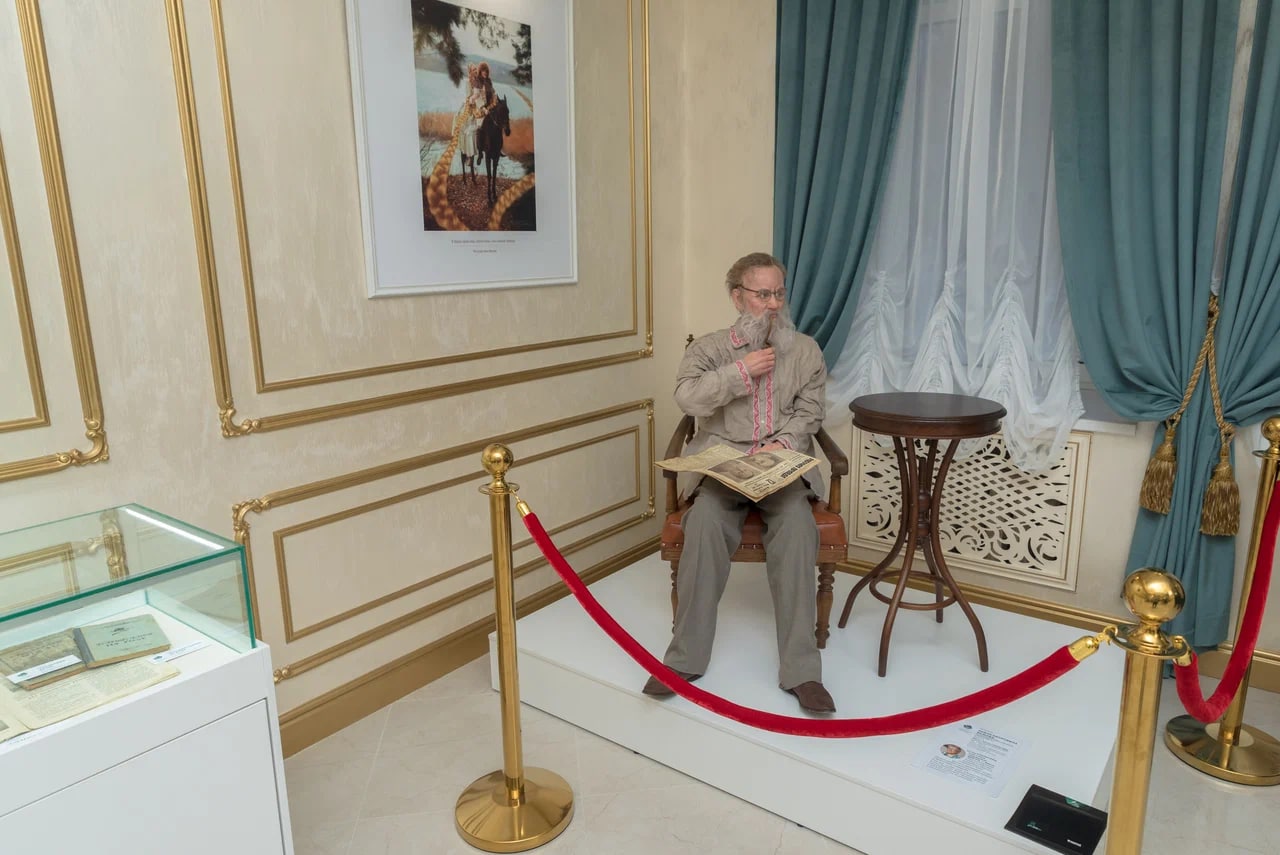 Есть и необычные работы: например, самая маленькая и самая большая в мире малахитовые шкатулки, глыба Полевского малахита весом 24 кг, царь-ларец с резьбой на мотивы сказов П.Бажова с отделкой уральскими поделочными камнями. А еще здесь можно увидеть малоизвестные литературные произведения П. Бажова, книги с автографом писателя. И он сам тоже есть в музее — посетителей встречает его скульптура в полный рост.