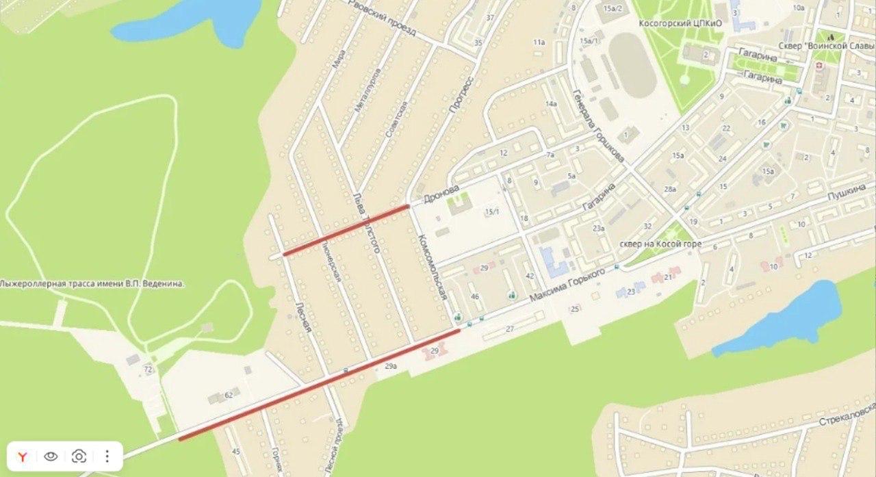 2. Косая Гора, ул. М. Горького, 14 (ост. ДК «Косая Гора») – ул. Максима Горького – лыжероллерный центр «Веденино».