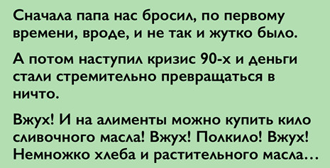 Мама, которая до этого работала в НИИ, пошла работать на завод разнорабочей. Там было тяжело, холодно, но зато вовремя (плюс-минус месяц) платили зарплату и можно было покупать еду. В основном это были макароны, хлеб, маргарин, но иногда, в получку, — куриный окорочок, что было по тем временам неземным лакомством.