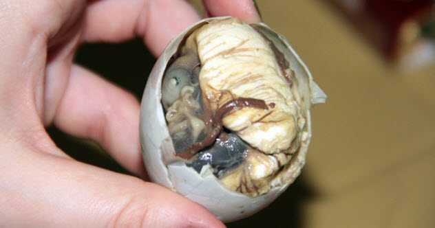Подумайте дважды, потому что под невинно выглядящей оболочкой яйца скрывается крошечный плод утки, которого сварили живьем. Мило. Для этого оплодотворенные утиные яйца на 20 дней помещают в инкубатор, а затем готовят, чтобы получилась эта ужасная вкусняшка.
