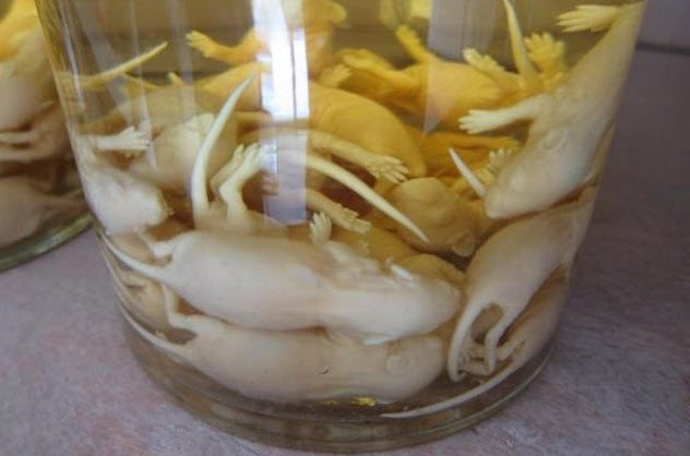 В любом случае, мышонка оставляют в вине на год. После этого «практически безопасно» пить этот «эликсир здоровья». Китайцы считают, что напиток может помочь при астме, хотя на вкус он, по-видимому, похож на бензин. Спасибо, мы предпочитаем Мерло.