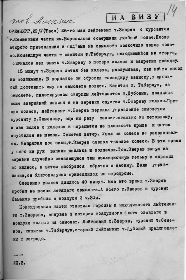 Тогда взлетел второй самолет, с него на веревке спустили колесо аварийному борту. Машина с курсантом на борту летала вокруг аэродрома, пока инструктор прилаживал колесо на место. Поскольку гайку и контровочную шпильку они благополучно пролюбили авиационным способом — инструктор замотал ось колеса веревкой. В итоге самолет таки сел — правда, колесо в конце пробежки соскочило, и самолет немного помял радиатор.
